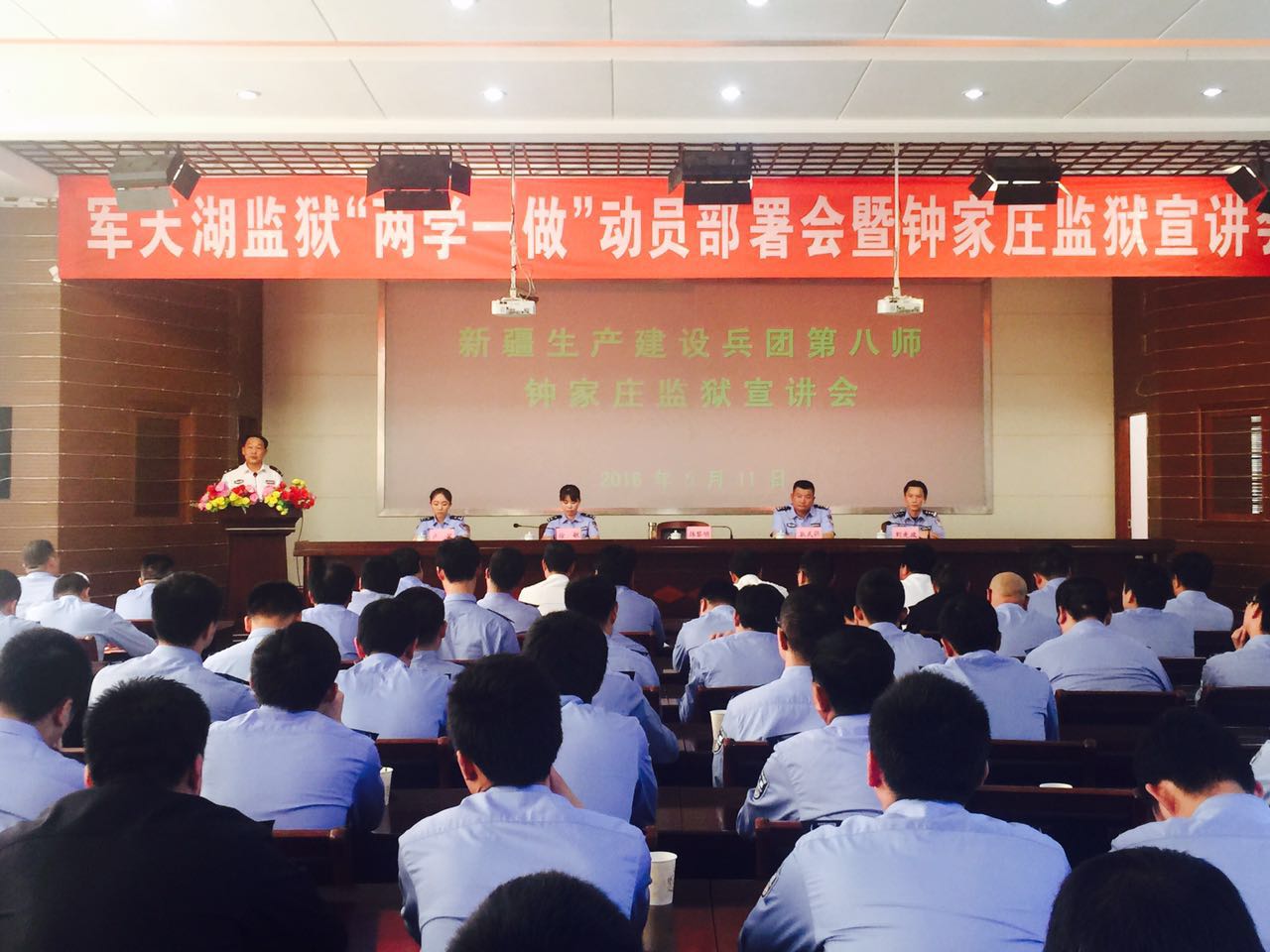 会上,军天湖监狱民警观看了钟家庄监狱先进事迹宣传片《脊梁》(2015年10月兵团卫视播出),报告团成员做了集体一等功先进事迹宣讲。先进事迹宣传片和报告团成员的精彩宣讲赢得了民警们的阵阵掌声,被军天湖监狱监狱长王立秋高度赞扬为“精神食粮”。