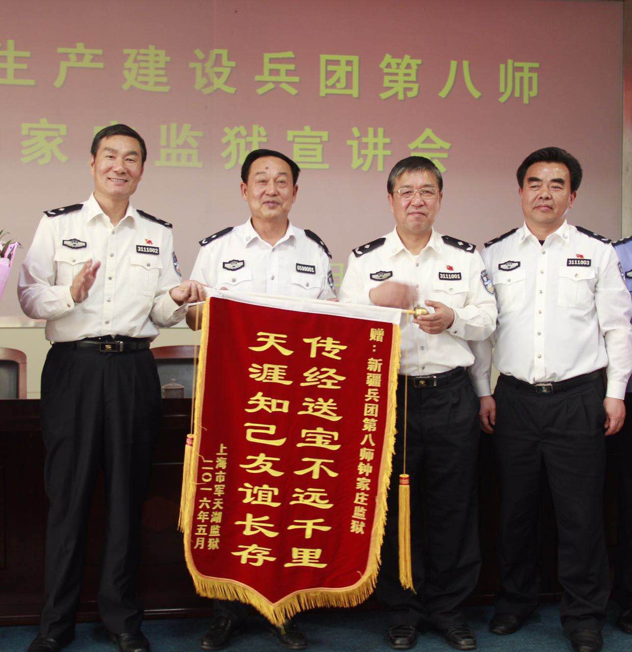 5月11日至13日,新疆生产建设兵团第八师钟家庄监狱先进事迹报告团一行来到共建单位上海市军天湖监狱考察交流并做先进事迹宣讲。钟家庄监狱于2015年8月被司法部授予全国司法行政系统集体一等功。