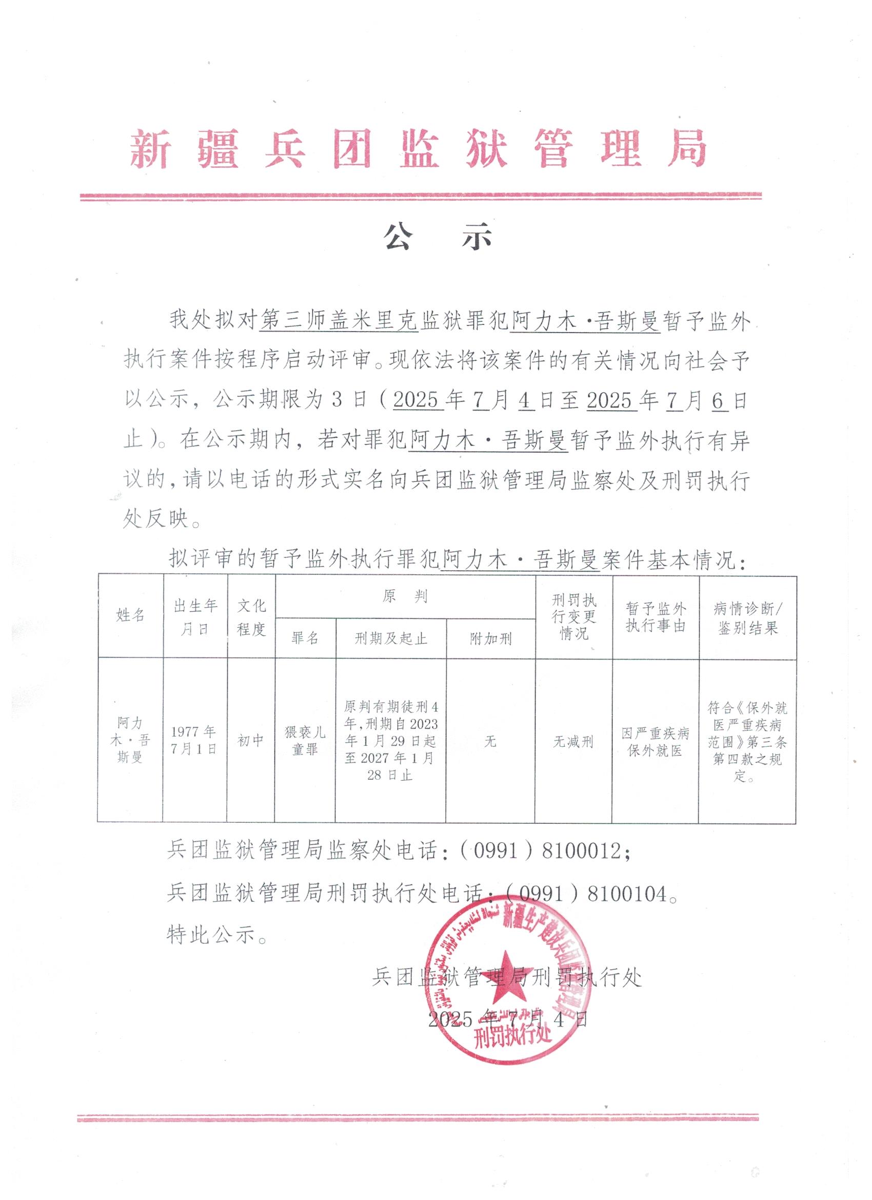 暂予监外执行公示(2025年007)