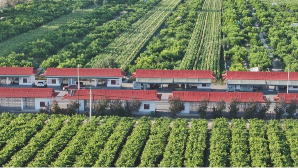 新疆生产建设兵团第八师石河子市一四三团九连,桃园绿意盎然,头戴草帽的果农在林荫下忙活。