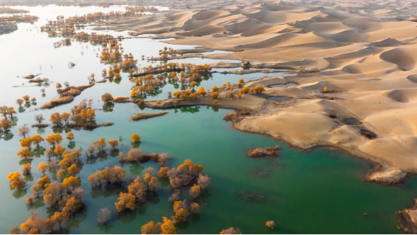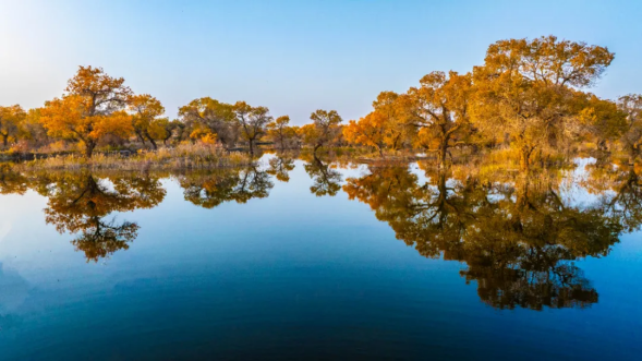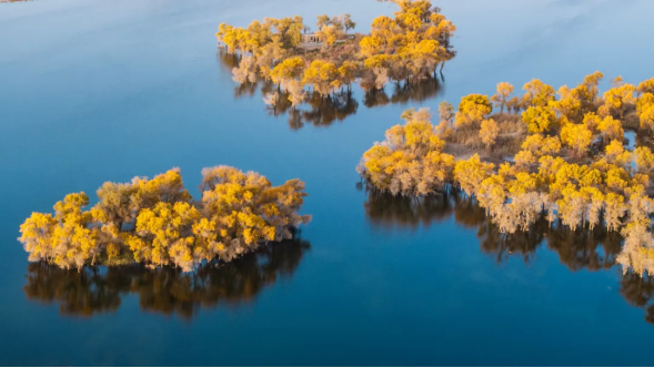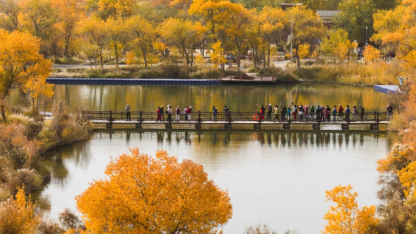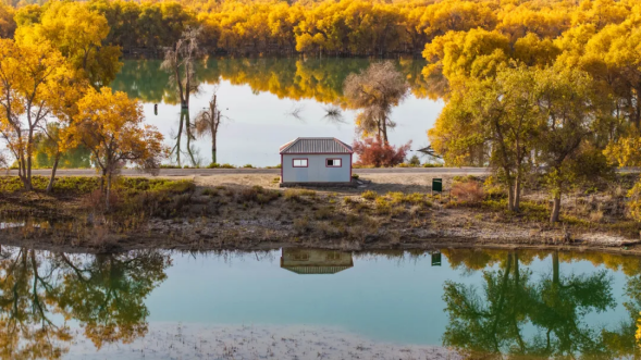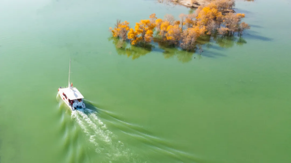 金黄的胡杨或立于湖畔,或长在水中,与澄澈的湖水交相辉映,倒影如镜。有的画面中还点缀着小屋,更有沙漠与水、胡杨的奇特组合,游船驶过泛起涟漪,游客在木桥驻足观赏,每一处都如诗如画,尽显秋日胡杨与水共生的独特韵味。