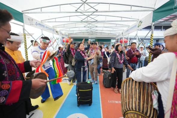 2025年2月18日,来自泰国和老挝的游客在出站口受到欢迎。新华社记者 陈欣波 摄