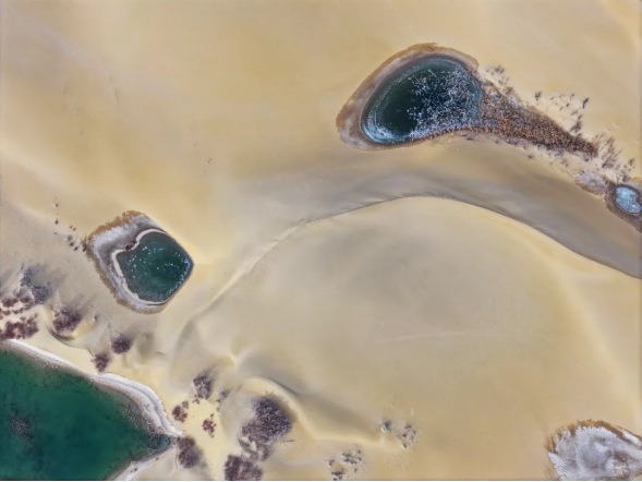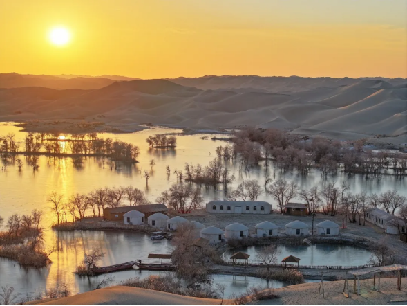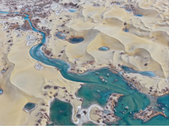 金沙似汹涌的浪涛,绵延至天际;蓝河如灵动的丝带,蜿蜒于沙山之间。而那散落四处的冰湖,恰似熠熠生辉的碎钻,在冬日熹微的阳光下,幻化成大地的瞳孔,凝望着浩渺苍穹。