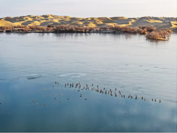 寒水悠悠,倒映着澄澈蓝天;流沙绵绵,轻拥着温润冰玉。河湾之处,凝结的冰蓝与沙丘的暖黄相互交织,恰似天地精心绘制的调色盘。冰面上,嬉戏的野鸟灵动活泼,为这片沉寂的沙漠唤醒了勃勃生机。