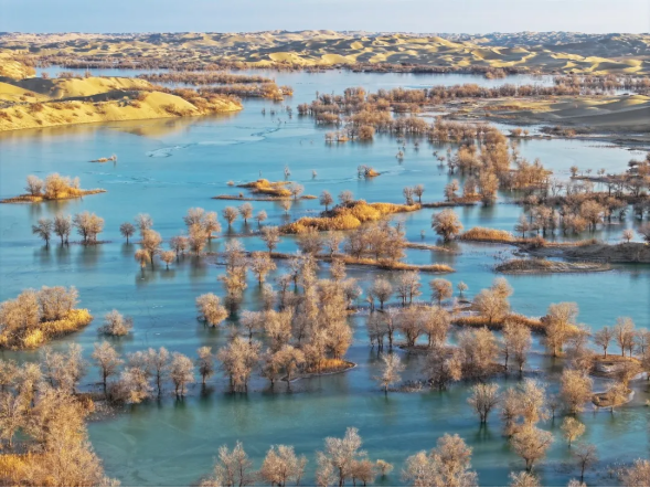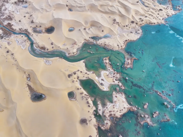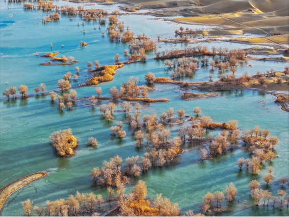 这,是沙与水跨越千年的深情对话,是寒冬里凝固的绝美诗行。在这里,荒芜与生机深情相拥,苍凉与璀璨共同铸就了这世间罕有的奇观。