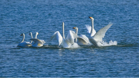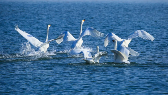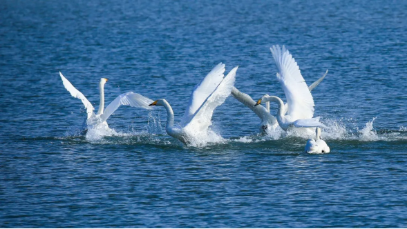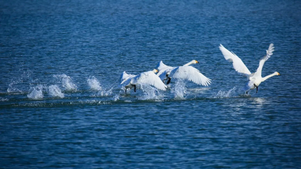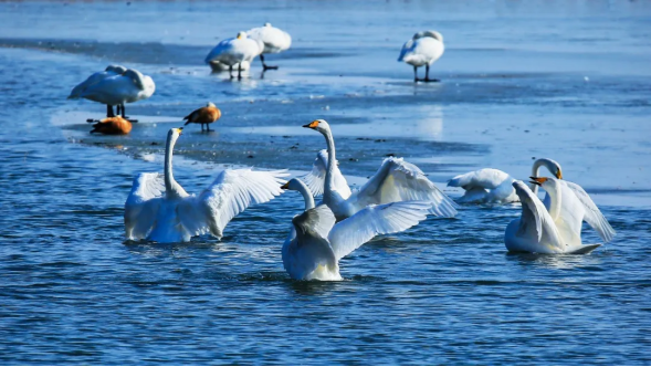 壮阔冰原澄澈无垠,尽显天地雄浑之美。白羽天鹅舒展优雅身姿,翩跹游弋于碧水间,灵动温婉。冰境的苍茫壮美与生灵的高贵优雅相融
