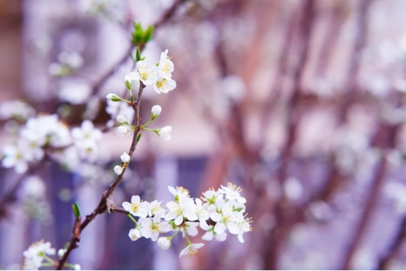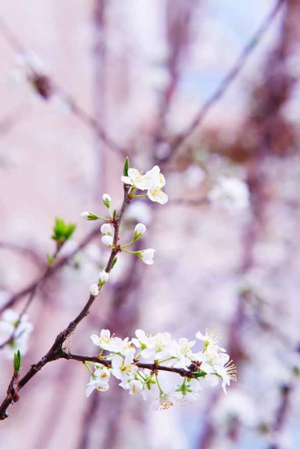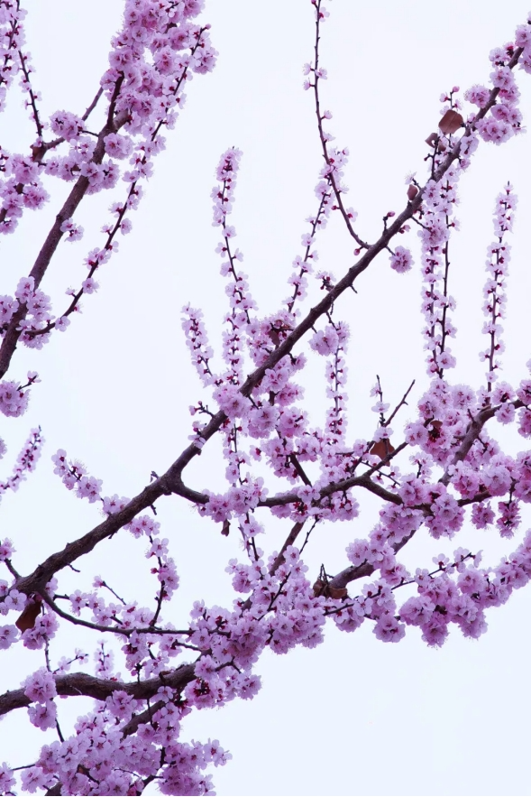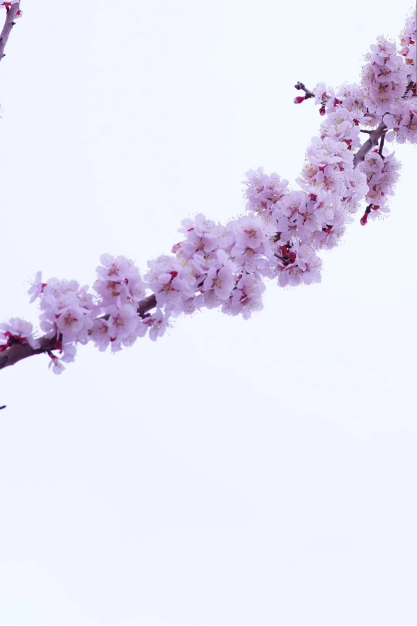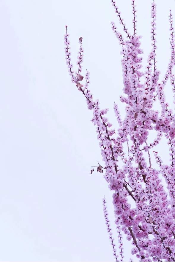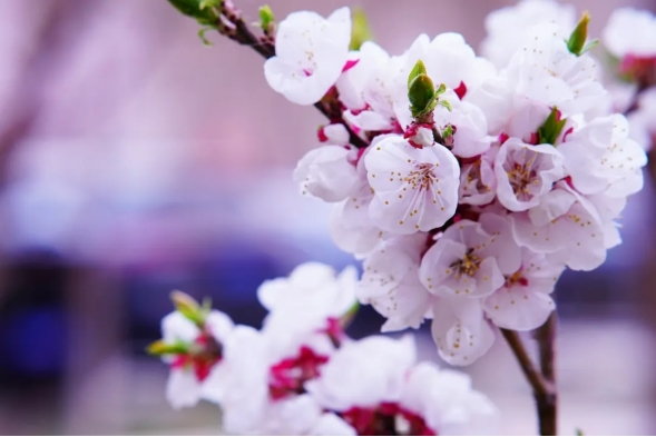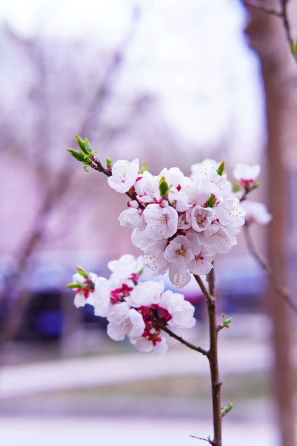 三月是杏花的季节,花朵开得恣意烂漫,白中透粉,粉里含羞,像是美妙少女腮边的胭脂,又像是宣纸上晕开的水彩。小城里的杏花如薄雾含烟,站在高处远眺,整条街被白色、粉色与浅紫色的杏花覆盖,这座小城仿佛化作了粉雕玉琢的童话世界。
